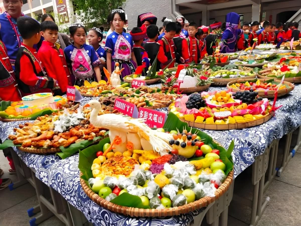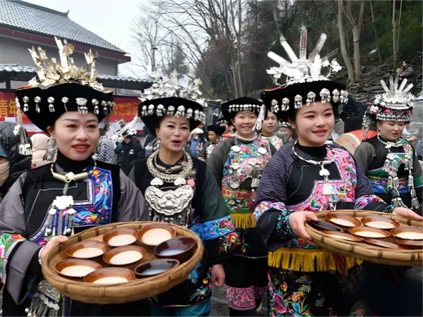 En las regiones de China habitadas por los miao, especialmente en los asentamientos principales de Qiandongnan, en Guizhou, y Rongshui, en Guangxi, existe una fiesta más grandiosa y distintiva que la Fiesta de Primavera: el Festival Miao. Es la celebración anual más importante de la etnia Miao, que marca la cosecha, honra a los antepasados y da la bienvenida al nuevo año. El Festival Miao se celebra normalmente después de la cosecha de otoño (entre el décimo y el duodécimo mes lunar, con fechas que varían según la región). La gente celebra grandes fiestas para dar gracias por la generosidad de la naturaleza y regocijarse por el trabajo realizado durante el año. El culto a los antepasados es la parte más sagrada. Al comienzo de la fiesta, cada familia prepara las ofrendas más abundantes, como arroz glutinoso, pescado, carne y vino de arroz, que los ancianos de la familia presentan con reverencia durante la ceremonia. Rezan para que los antepasados bendigan la prosperidad de la familia y un año de buen tiempo. Tras los ritos sacrificiales y los banquetes familiares, toda la aldea miao sale de los confines privados de los hogares y se reúne en la plaza, transformándose en una escena bulliciosa y exuberante de prosperidad. Las mujeres miao, ataviadas con sus mejores galas festivas, lucen enormes tocados de plata, collares de plata que rodean sus cuellos en capas y capas, y se envuelven en espléndidas prendas bordadas con motivos étnicos. Irradian un brillo deslumbrante, su esplendor es realmente impresionante. Los conjuntos de flautas de caña de cada aldea se colocan en círculo y tocan sus instrumentos con sonidos agudos y resonantes mientras interpretan la danza rítmica y distintiva de las flautas de caña. Cuando las celebraciones alcanzaron su punto álgido, los aldeanos organizaron su famosa «fiesta de la mesa larga». Cientos y cientos de mesas se alinearon una tras otra a lo largo de la calle principal del pueblo, extendiéndose hasta donde alcanzaba la vista. Todos los habitantes del pueblo y los invitados venidos de lejos se sentaron uno al lado del otro, con las mesas repletas de especialidades miao: sopa agria de pescado, cerdo curado, arroz glutinoso y mucho más. Todos participan en el festín mientras disfrutan de la alegría de la abundante cosecha.