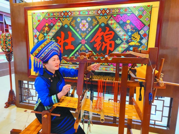 La etnia Zhuang no solo tiene talento para el canto y la danza, sino que también es excepcionalmente hábil. Gracias a su excepcional ingenio, ha creado una magnífica obra maestra de la artesanía: el brocado Zhuang. Famoso por sus colores vivos, su meticulosa confección, sus exquisitos diseños y su profundo significado cultural, se encuentra junto al brocado Yun, el brocado Shu y el brocado Song como uno de los cuatro grandes brocados de China. Como uno de los símbolos visuales más vivos y espléndidos de la cultura Zhuang, encarna la memoria histórica, las aspiraciones estéticas y la filosofía de vida de esta etnia. La historia del brocado Zhuang se remonta a la dinastía Han. Con el paso del tiempo, las técnicas de tejido maduraron y los diseños se volvieron cada vez más intrincados. Este antiguo arte fue inscrito en 2006 en la lista inaugural del Patrimonio Cultural Inmaterial Nacional, consolidando su estatus como un tesoro cultural apreciado y compartido por la nación china. Aunque el brocado Zhuang se enfrenta a los retos que plantean la producción mecanizada y los cambios en los estilos de vida, su valor cultural y su atractivo artístico son cada vez más reconocidos. Los diseñadores han combinado los motivos tradicionales con conceptos de diseño contemporáneos, impulsando este antiguo tejido al escenario internacional de la moda. Incluso se ha presentado como regalo de Estado a dignatarios extranjeros.