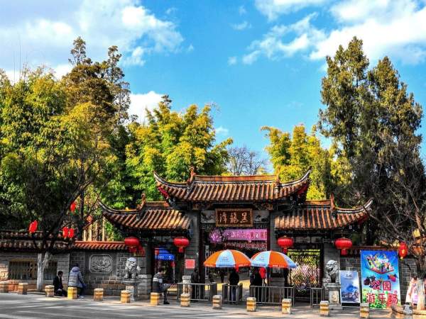 Cerca del Estanque del Dragón Negro se encuentra el Palacio del Dragón Negro, construido en 1394, en el reinado del emperador Hongwu de la dinastía Ming (1368 - 1644), y reconstruido en 1454, en el reinado del emperador Jingtai de la dinastía Ming. Todo el palacio consta de tres salas y dos patios, y en la sala principal hay una placa de piedra escrita por el gobernador de Yunnan en la dinastía Qing para elogiar las vistas pintorescos del estanuqe. El Palacio del Dragón Negro también recibe el nombre del Templo Inferior, porque al caminar por los escalones de piedra legan directamente al Templo Superior, el Templo de la Fuente del Dragón, que está oculto entre árboles centenarios. Este templo de 570 años de antigüedad incluye la Sala de la Deidad del Trueno, la Sala del Polo Norte, la Sala Sanqing, la Sala del Emperador de Jade y otras salas en las que se rinde culto a las deidades del taoísmo.