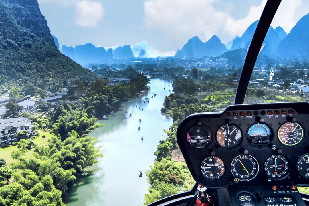 Hotel pickup in Guilin city with an English-speaking guide waiting in the lobby. Travel to Yangshuo in an air-conditioned business van. Arrive at Yangshuo Aviation Camp for an experience choice: Option A - Hot air balloon sightseeing with aerial views of karst landscapes; Option B - Helicopter tour for aerial panoramas of the Li River. Note: Confirm choice 24 hours in advance. Proceed to Yangshuo West Street area for a free-choice lunch at guide-recommended restaurants: traditional beer fish spot, international cuisine eatery including Western options, or local farmhouse specialty venue.
